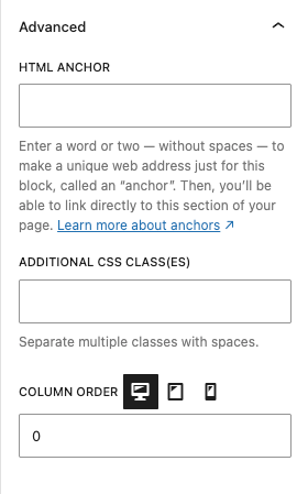 Each column includes a Column Order setting in the Advanced panel. This setting allows you to control the sequence in which columns appear on desktop, tablet, and mobile.
