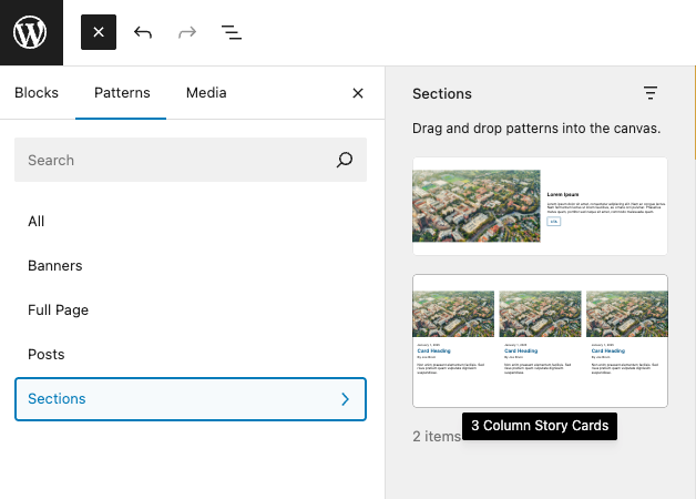 Add the Three Column Story Cards from the Patterns > Sections library.
